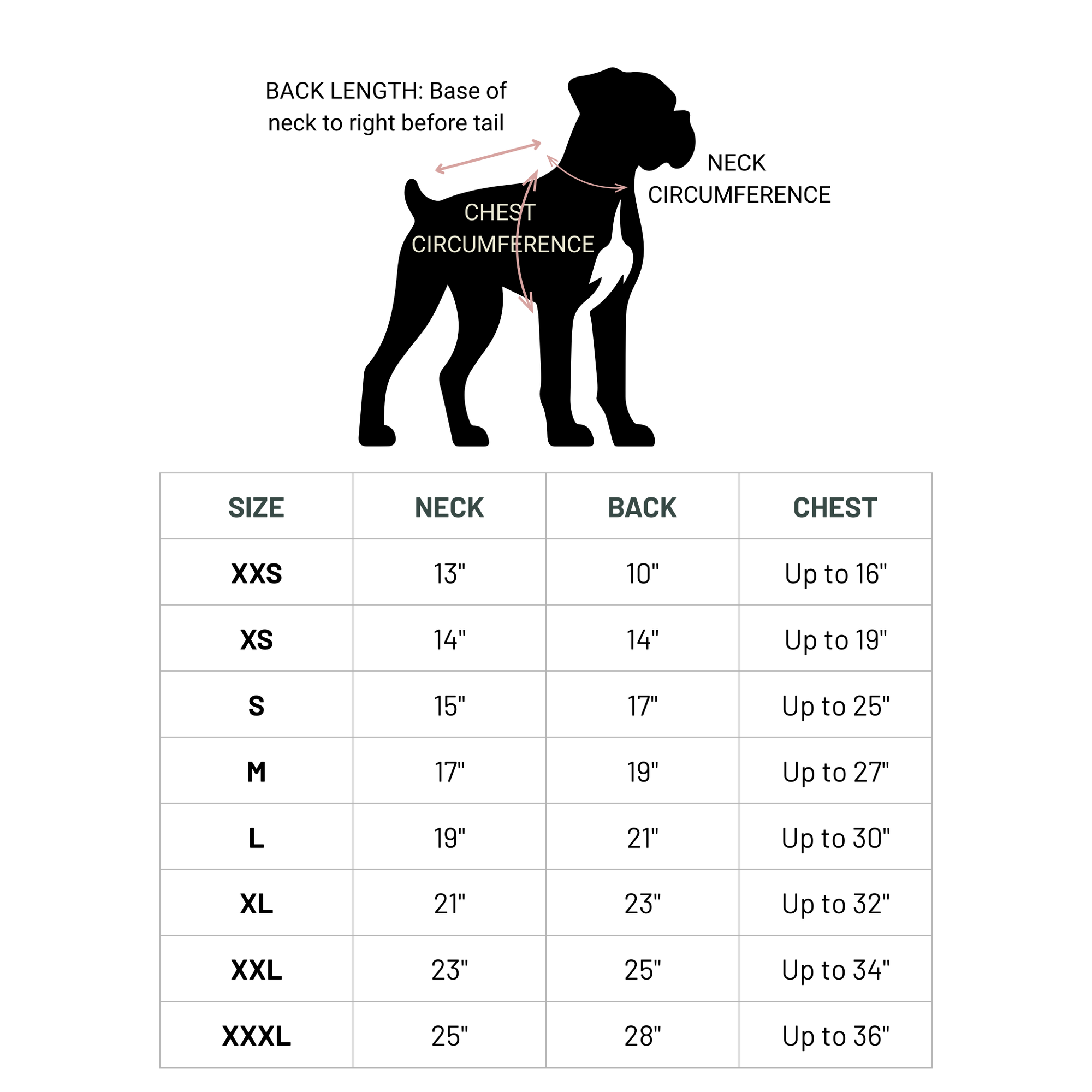 Start by measuring your pup's NECK CIRCUMFERENCE, followed by BACK LENGTH and CHEST CIRCUMFERENCE.